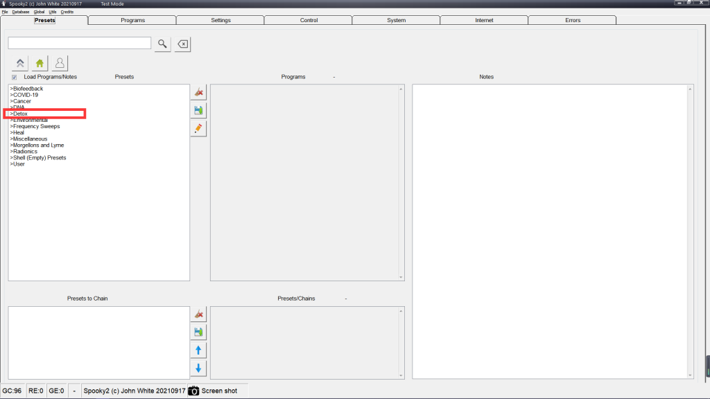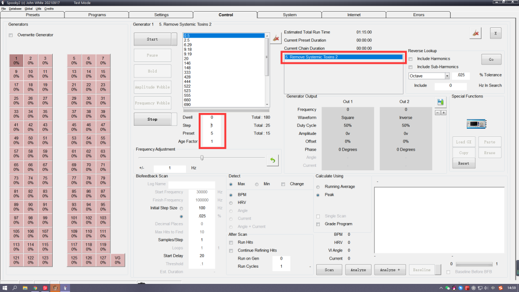 Ahora, ve a la pestaña Control en el software Spooky2 e ingresa el número del preajuste en el campo Preset, ubicado justo debajo de Dwell y Step.