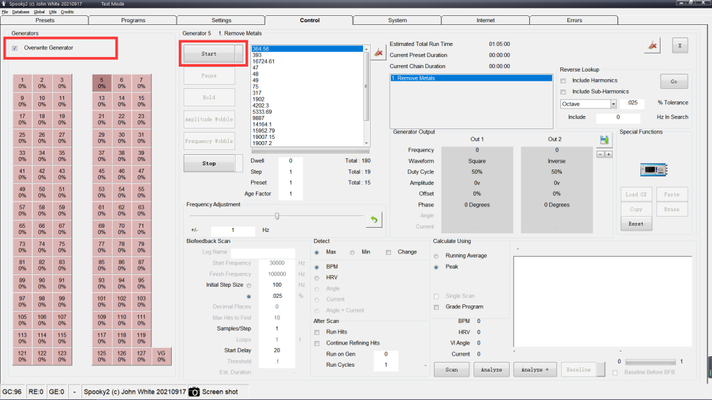 En la pestaña Control, haz clic en “Overwrite Generator” y selecciona la salida de frecuencia correspondiente. Finalmente, puedes hacer clic en “Start” para iniciar el preajuste. Este se ejecutará durante 11 días y cambiará automáticamente entre diferentes programas.