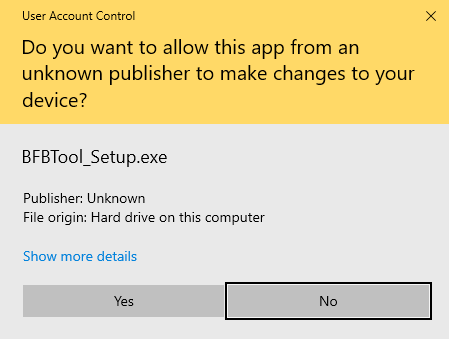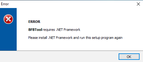 Antes de instalar BFBTool, debes tener instalado .NET Framework 3.5. Si no lo tienes instalado, verás el siguiente error.