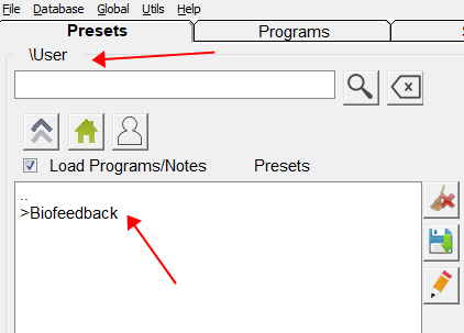 También puedes crear un preajuste con un programa de la base de datos de Spooky2 que se ajuste a tu condición. Puedes comenzar con los preajustes vacíos (Shell) en la pestaña Presets (“Preajustes”) y luego agregar varios programas que se ajusten a tu condición específica (por ejemplo, diabetes, afección cardíaca, etc.).