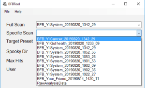 Después de finalizar tu escaneo de biorretroalimentación en Spooky2, abre BFBTool. Haz clic en el botón de flecha hacia abajo en el cuadro combinado junto a la etiqueta Full Scan (“Escaneo completo”) y aparecerá un menú con una lista de archivos de datos de escaneo de biorretroalimentación para elegir. Selecciona el archivo de datos del escaneo de biorretroalimentación que desees.