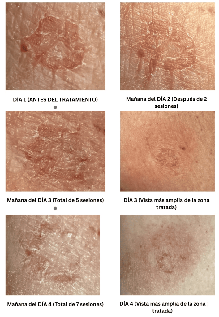 La usuaria optó por comenzar con un enfoque localizado y superficial utilizando un dispositivo portátil de luz que ya tenía, conocido como “pistola de rayos”. El protocolo que siguió fue intencionadamente simple y consistente: