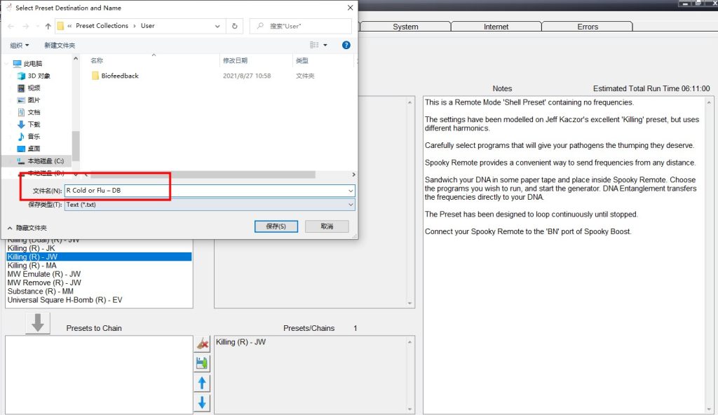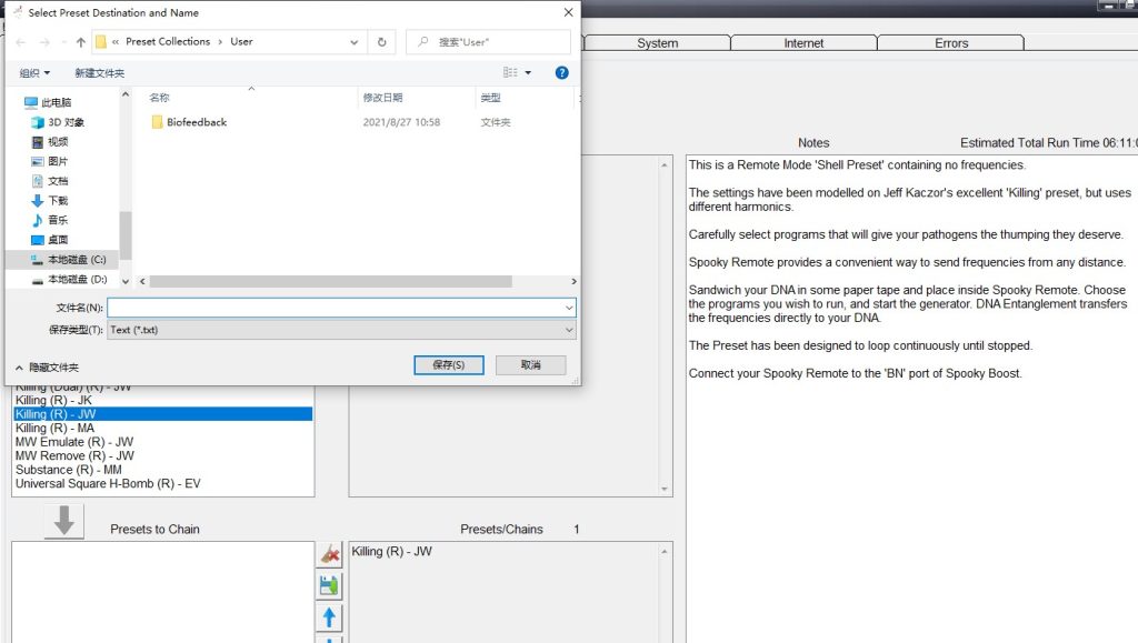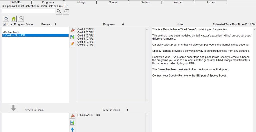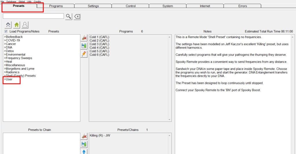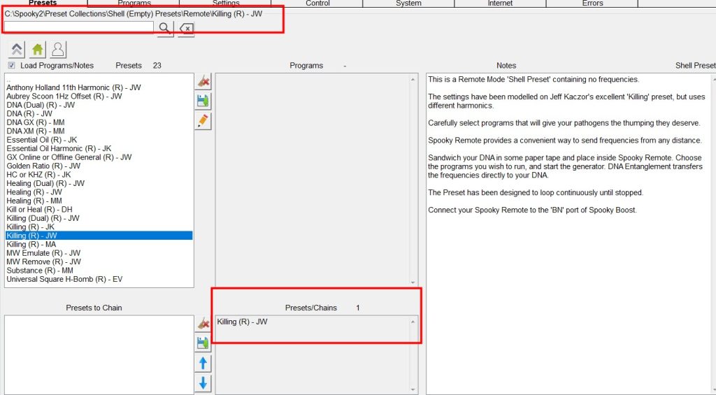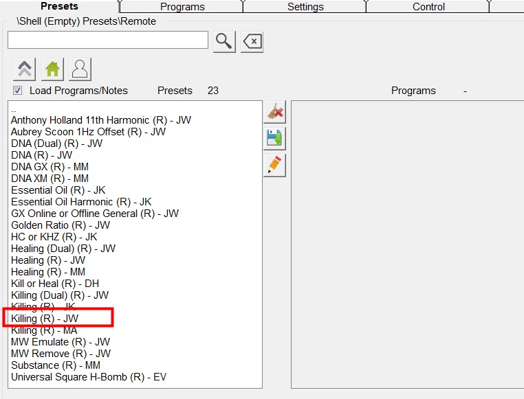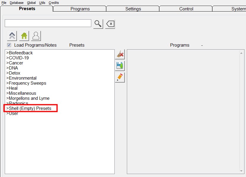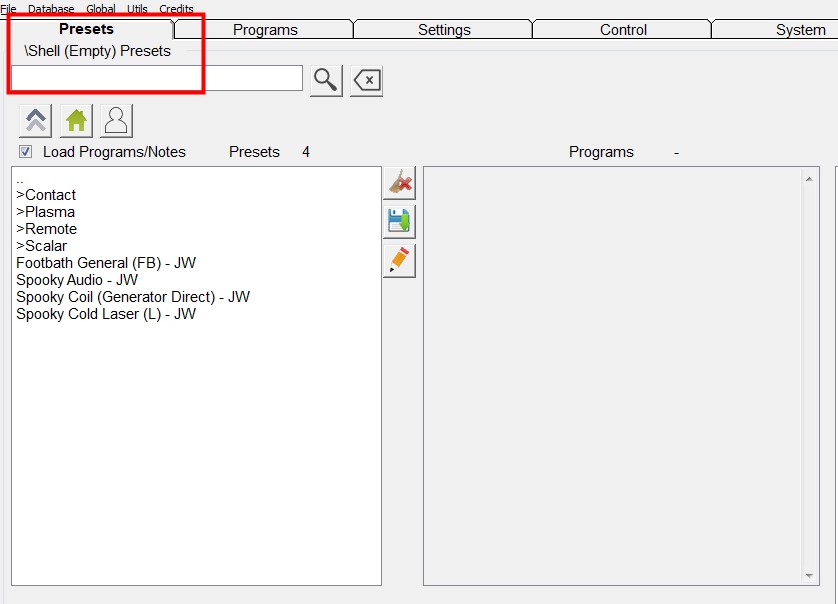 El software Spooky2 incluye dos tipos de preajustes: Preajustes de fábrica (con frecuencias) y Preajustes vacíos “Shell” (sin frecuencias). Para crear nuestros propios preajustes, necesitamos crearlos a partir de preajustes vacíos “Shell”.