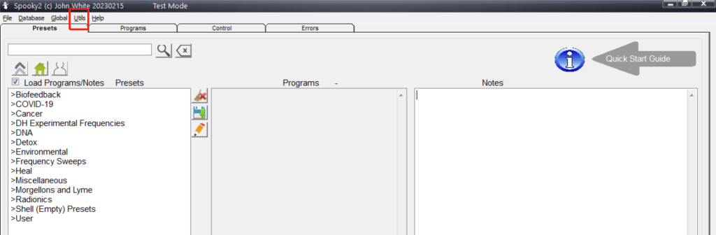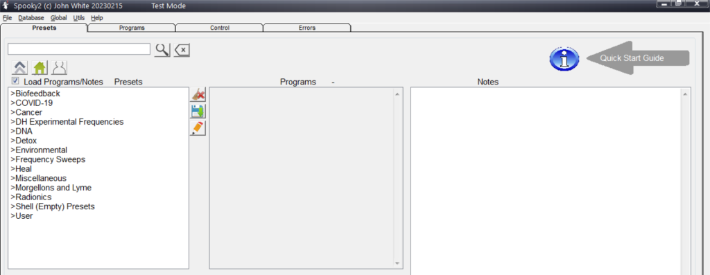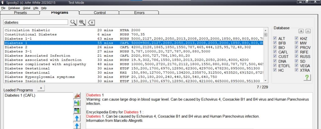 Si no encuentras tu condición en la pestaña Presets, puedes optar por un preajuste vacío y buscar programas en la pestaña Programs, ingresando el nombre de tu enfermedad. En la base de datos de Spooky2 hay más de 60,000 programas, por lo que seguramente encontrarás alguno adecuado.