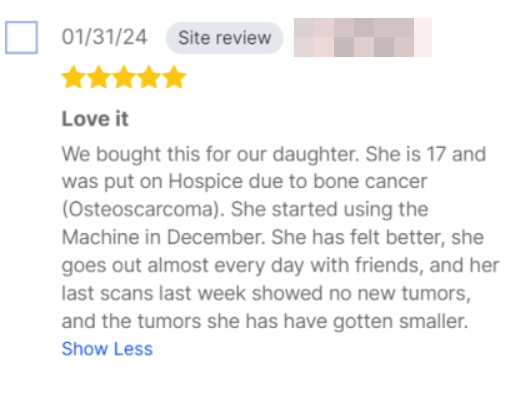 Compramos esto para nuestra hija. Tiene 17 años y fue ingresada en cuidados paliativos debido a un cáncer óseo (osteosarcoma). Comenzó a usar el dispositivo en diciembre. Se ha sentido mejor, sale casi todos los días con sus amigos, y los últimos estudios realizados la semana pasada mostraron que no hay nuevos tumores y que los tumores que tenía se han reducido. “
