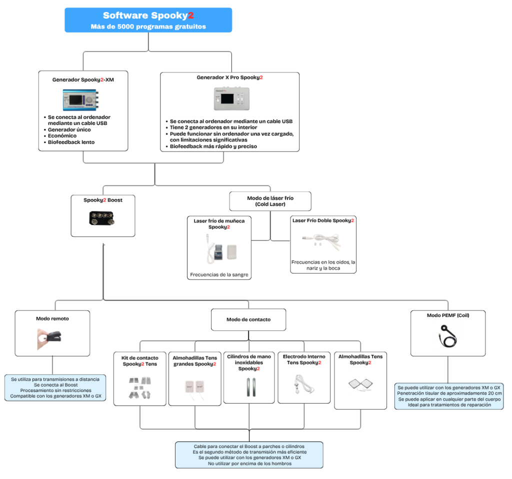 ¿Qué es Spooky2? Spooky2 es un sistema que transmite frecuencias Rife para ayudarte a recuperar la salud. Incluye tanto hardware (generadores, dispositivos remotos y accesorios) como software que trabajan en conjunto para entregar frecuencias adaptadas a tu condición. El sistema puede utilizarse para una amplia variedad de problemas de salud, incluyendo insomnio, enfermedad de Lyme e incluso enfermedades crónicas.