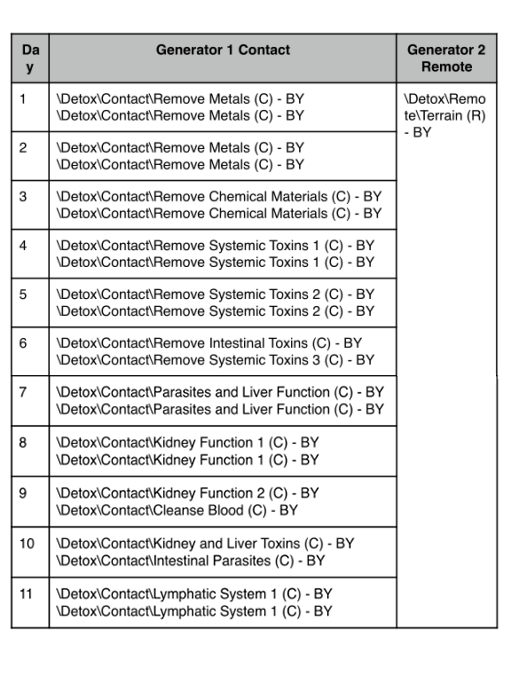 R: En el modo contacto, se ejecutan dos conjuntos de frecuencias diariamente durante 11 días, tal como se especifica en la columna del Generador 1 en la tabla más abajo. Cada conjunto dura 2 horas y va seguido de un pitido. Puedes ejecutar el primer conjunto por la mañana y el segundo conjunto de 6 a 12 horas después. Opcionalmente, puedes repetir cada conjunto más de una vez.