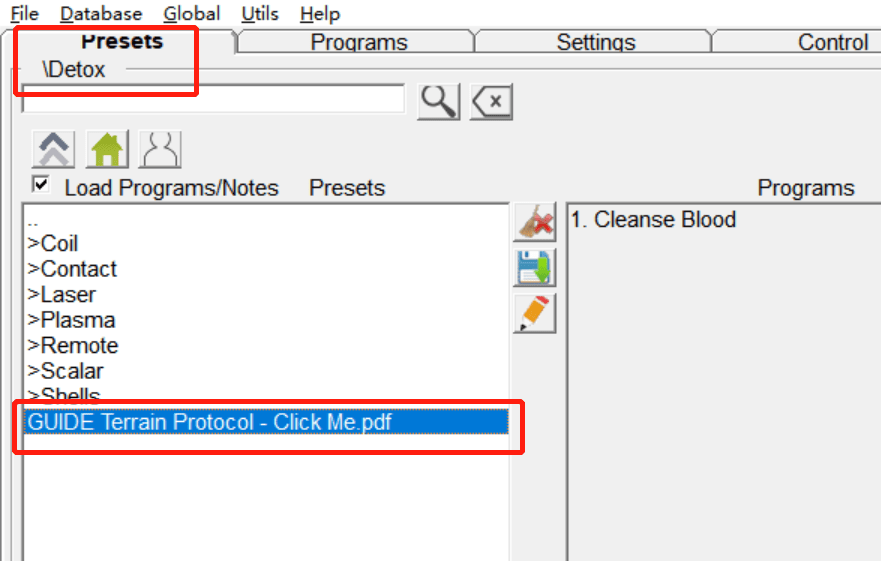 R: Hay cuatro ajustes preestablecidos remotos para desintoxicación en el software Spooky2: