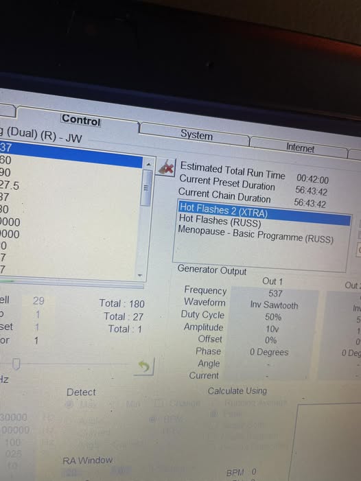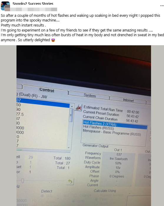 Así que, después de un par de meses de sofocos y de despertarme empapada en la cama todas las noches, introduje este programa en la máquina Spooky2 Los resultados fueron prácticamente instantáneos. Voy a probarlo con algunas de mis amigas para ver si obtienen los mismos resultados increíbles… Ahora solo tengo pequeños sofocos mucho menos frecuentes y ya no me despierto empapada en sudor en la cama. Estoy encantada.🤩