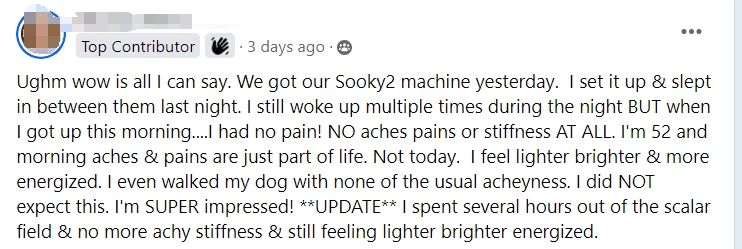 ¡Uf! ¡Guau! Es todo lo que puedo decir. Ayer recibimos nuestra máquina Spooky2. La instalé y dormí entre ellas anoche. Aún me desperté varias veces durante la noche, PERO cuando me levanté esta mañana… ¡no tenía dolor! Nada de dolores ni rigidez.
