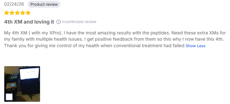 Mi cuartoXM (con mi XPro).Obtuve resultados increíbles con los péptidos. Necesito estos XM adicionales para mi familia con múltiples problemas de salud. Recibo comentarios positivos, por eso ahora tengo 4. ¡Gracias por darme el control de mi salud cuando el tratamiento convencional había fallado!