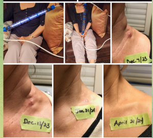 El 7 de diciembre de 2023, cuando comencé mi primer tratamiento con Spooky2, tomé una foto de los grandes ganglios linfáticos de mi cuello. El 31 de enero de 2024, apenas un mes y medio después, tomé otra foto y apenas se pueden ver los ganglios linfáticos inflamados.