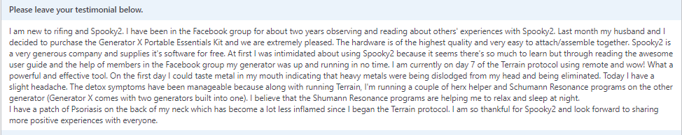 Soy nueva en la terapia Rife y en Spooky2. He estado en el grupo de Facebook durante unos dos años, observando y leyendo las experiencias de otras personas con Spooky2. El mes pasado, mi esposo y yo decidimos comprar el Kit Esencial Portátil con GeneratorX Pro, y estamos encantados.