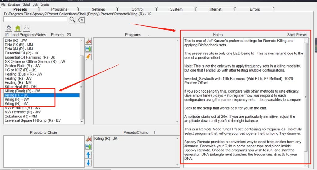 Elige el modo de transmisión (contacto, remoto, plasma) y el preajuste “Killing”. En este ejemplo, ejecutaré el resultado en modo remoto.
