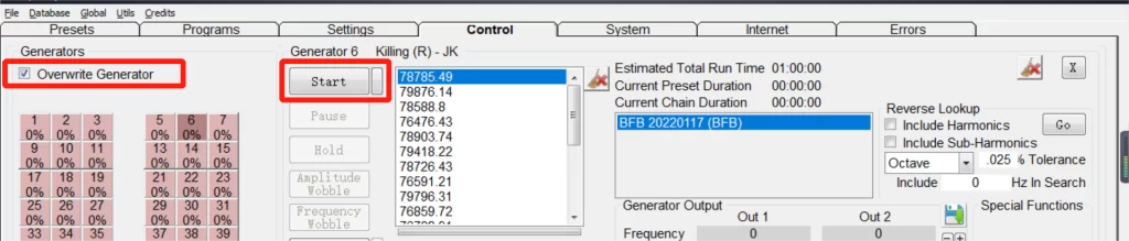 - Ve a la pestaña “Control”, marca “Sobrescribir generador” y haz clic en el botón de tu generador. Pulsa “Iniciar“. El botón del canal se volverá verde.